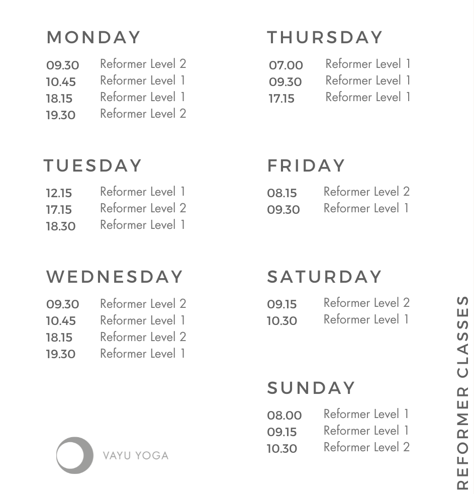 Reformer Pilates, like other styles of Pilates, works the entire body through a series of repetitive exercises, helping to improve strength, postural alignment and muscle balance. Reformer Pilates makes use of a very unique piece of exercise equipment comprised of a sliding carriage, springs, handles and foot-bar to provide resistance against each motion. Reformer Level 1 classes are for beginners, those returning to reformer pilates after a break or following treatment from an injury. These classes are slower in pace, with lots of support and guidance. We advise that anybody new to the reformer starts with one Level 1 class, to familiarise themselves with the machine before progressing.
